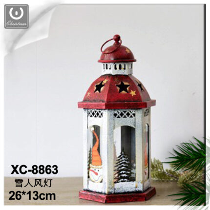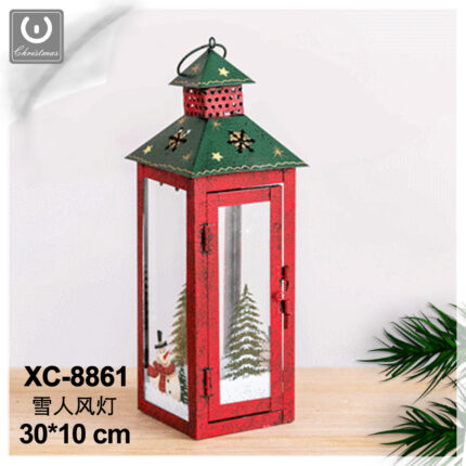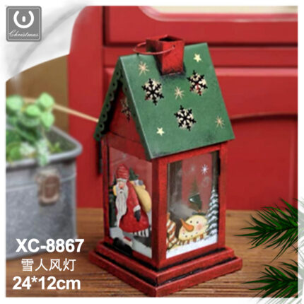Addobbo decorativo Natalizio lanterna rossa e verde in ferro con Pupazzo di neve dimensioni 30x10cm
