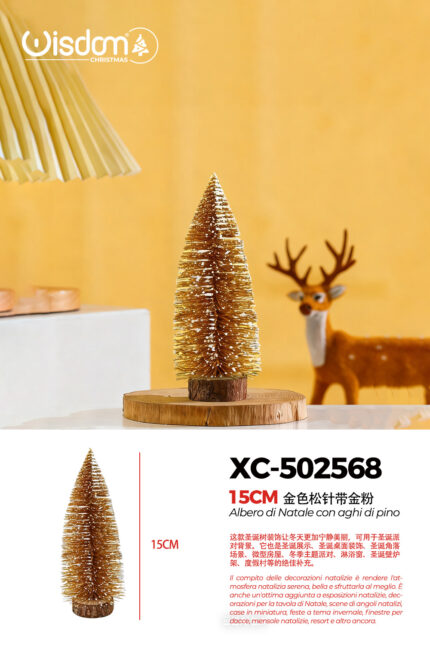 Alberello di Natale decorativo innevato con polvere d’oro da tavolo materiale pvc effetto legno dimensioni 15cmH
