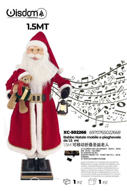 Giocattolo Natalizio Babbo Natale mobile e pieghevole con sensore di movimento canta e balla altezza 1,5 metri alimentazione a corrente (9v)
