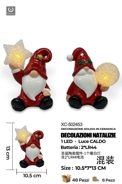 Gnomo Natalizio in ceramica con luce LED calda dimensione 10,5x7x13cm alimentazione a batterie (2 non incluse)