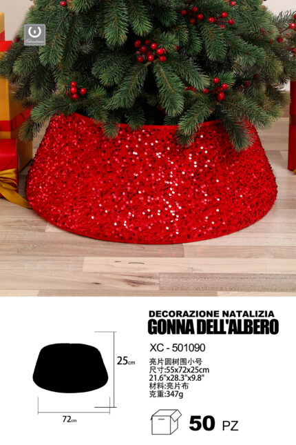 Decorazione natalizia gonna copri base per albero di natale in tessuto paillettes colore rosso dimensioni 55x72x25cm