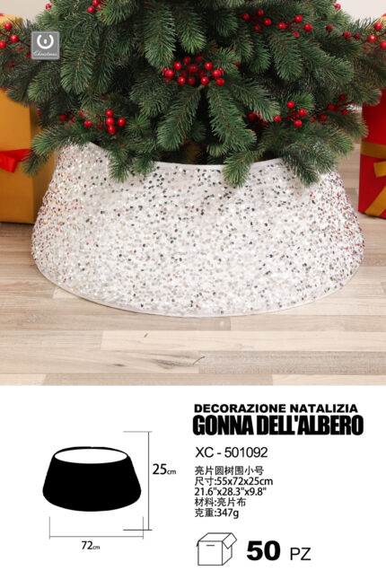 Decorazione natalizia gonna copri base per albero di natale in tessuto paillettes colore argento dimensioni 55x72x25cm