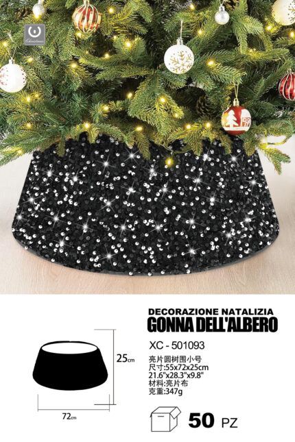 Decorazione natalizia gonna copri base per albero di natale in tessuto paillettes colore nero dimensioni 55x72x25cm