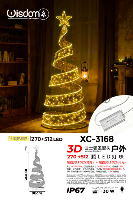 Albero di Natale a spirale 3D con 782LED totali luce calda fissa e lampeggiante altezza 2,1 metri protezione grado IP67 indicato per uso esterno