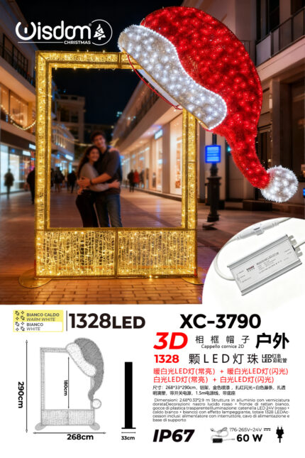 Cornice foto luminosa natalizia 3D 1328 luci LED calda fissa e intermittente struttura in alluminio verniciato dimensioni 268x180x290cm IP67 per uso esterno