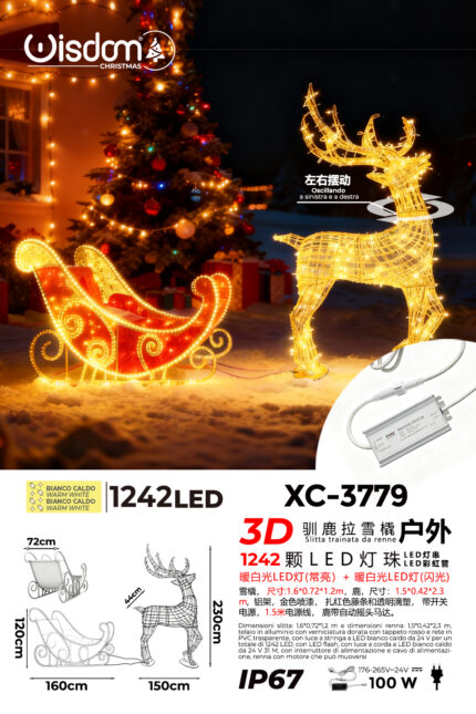 Slitta con renna Natalizia 3D 1242 luci LED calda fissa e intermittente struttura in alluminio verniciato IP67 per uso esterno