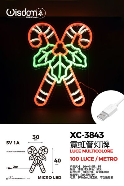 Figura luminosa Bastoncini di Zucchero a neon40x30 cm, attacco USB