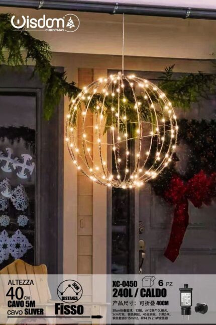 Lampada a Sfera pieghevole filo in Rame Argento da 240 LED, luce calda ,con 40 cm di diametro