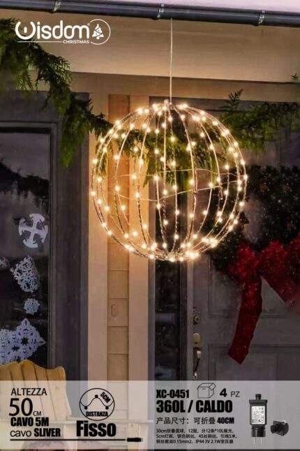 Lampada a Sfera pieghevole filo in Rame Argento da 360 LED, luce calda ,con 50 cm di diametro