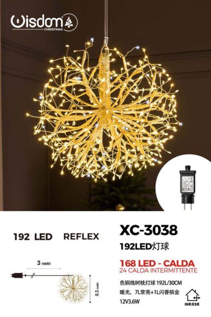 Lampada a sospensione a sfera in filo di rame color oro champagne 192 LED a Luce Calda + calda intermittente, diametro 30cm