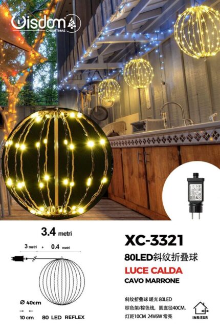 Lampada a Sfera pieghevole cornice Bianca , cavo trasparente da 80 LED, luce calda ,con 40 cm di diametro