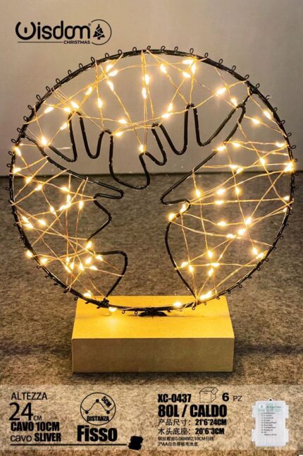 Lampada circolare Testa di Cervo cavo Argento,80 LED luce Calda, base in Legno , H 24 cm, vano batterie