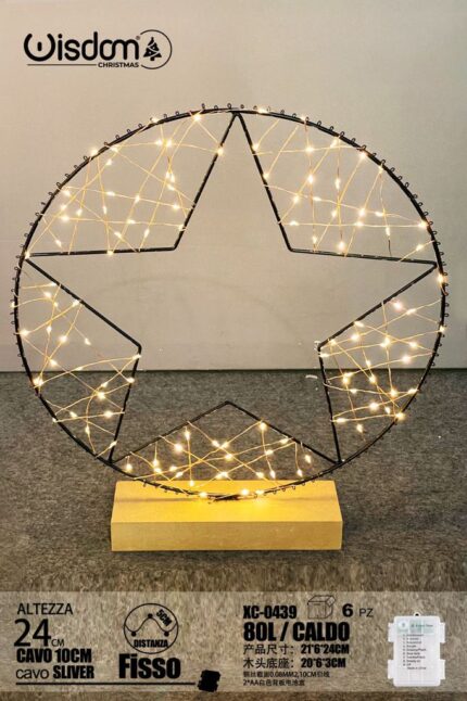 Lampada circolare Stella, 80 LED luce Calda, cavo Argento ,base in Legno , H 24 cm, vano batterie