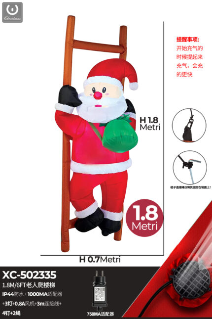 Gonfiabile Natalizio a forma Babbo Natale+scala con luci altezza 1,8 metri IP44 adatto per uso esterno
