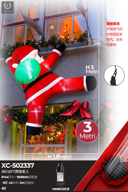 Gonfiabile Natalizio a forma di Babbo Natale che si arrampica con luci altezza 3 metri IP44 adatto per uso esterno