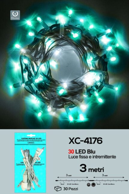 Catena 30 LED luce blu fissa e bianca intermittente, cavo bianco, collegabile