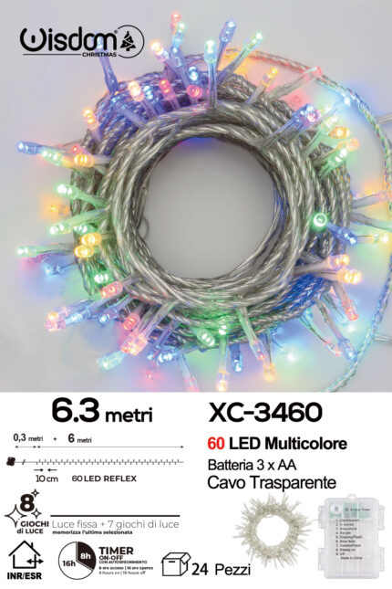 Catena luminosa da 6,3 metri 60 LED REFLEX luce multicolor con luce fissa+7 giochi alimentazione a batterie (non incluse) per uso interno/esterno funzione timer on/off