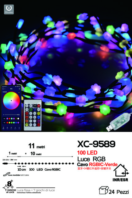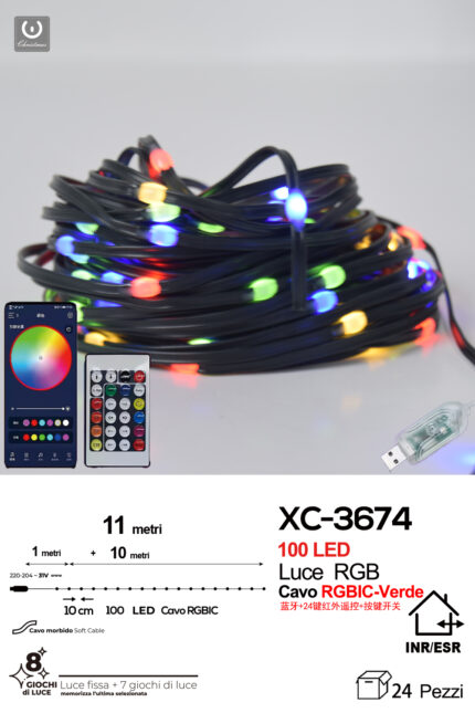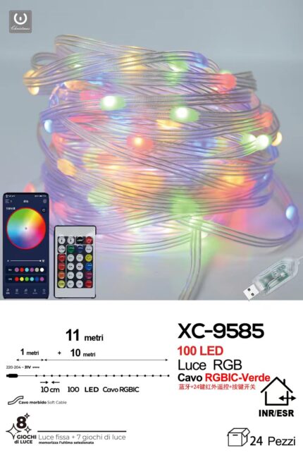 Catena luminosa 100 LED RGB lunghezza 11 metri controllo tramite app o telecomando 8 giochi luce disponibili