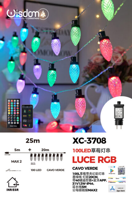 Catena luminosa 25 metri a LED RGB forma di fragole luminose controllo tramite app o telecomando