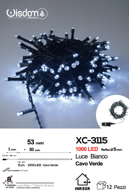 Catena luminosa 1000 LED luce bianca da 53 metri con 8 giochi di luce ip44 per uso interno esterno