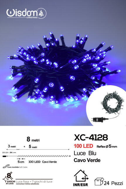 Catena luminosa 100 LED luce blu da 8 metri con 8 giochi di luce ip44 per uso interno esterno