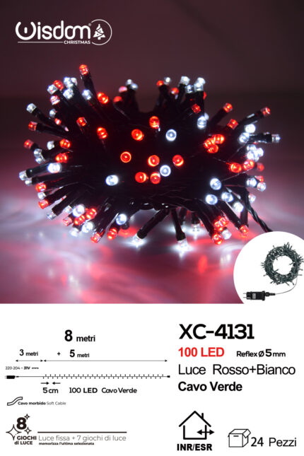 Catena luminosa 100 LED luce rossa+bianca da 8 metri con 8 giochi di luce ip44 per uso interno esterno
