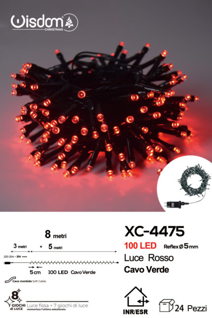 Catena luminosa 100 LED luce rossa da 8 metri con 8 giochi di luce ip44 per uso interno esterno