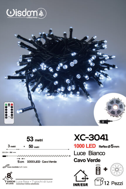 Catena luminosa 1000 LED luce bianca da 53 metri con 8 giochi di luce e telecomando ip44 per uso interno esterno