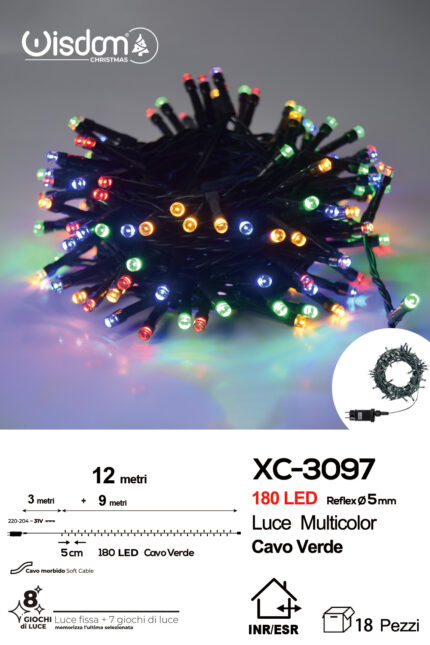Catena luminosa 180 LED luce multicolore da 12 metri con 8 giochi di luce ip44 per uso interno esterno
