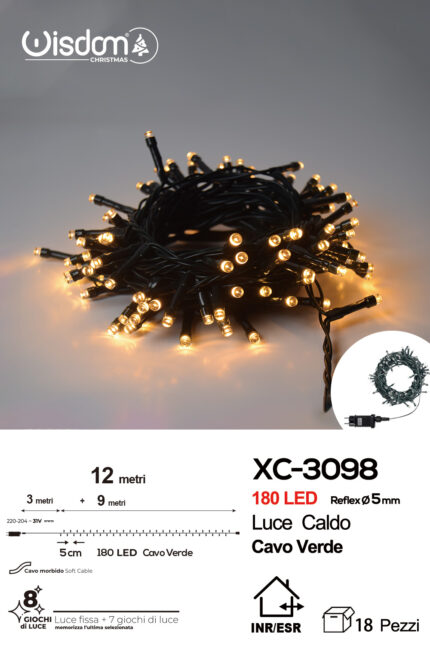 Catena luminosa 180 LED luce calda da 12 metri con 8 giochi di luce ip44 per uso interno esterno