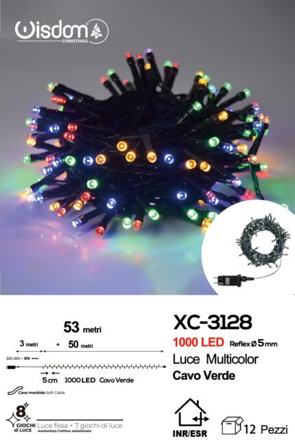 Catena luminosa 1000 LED luce multicolor da 53 metri con 8 giochi di luce ip44 per uso interno esterno