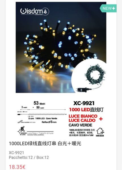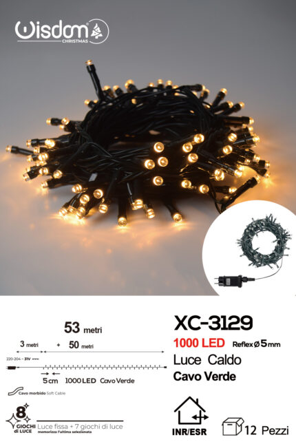 Catena luminosa 1000 LED luce bianca+calda da 53 metri con 8 giochi di luce ip44 per uso interno esterno