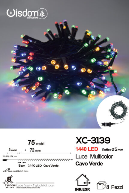 Catena luminosa 1440 LED luce multicolor da 75 metri con 8 giochi di luce ip44 per uso interno esterno