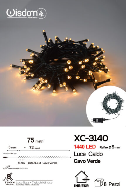 Catena luminosa 1440 LED luce calda da 75 metri con 8 giochi di luce ip44 per uso interno esterno