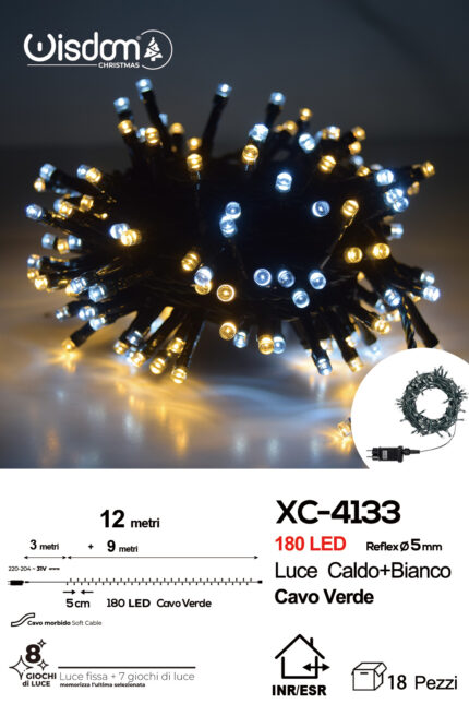 Catena luminosa 180 LED luce calda+bianca da 12 metri con 8 giochi di luce ip44 per uso interno esterno