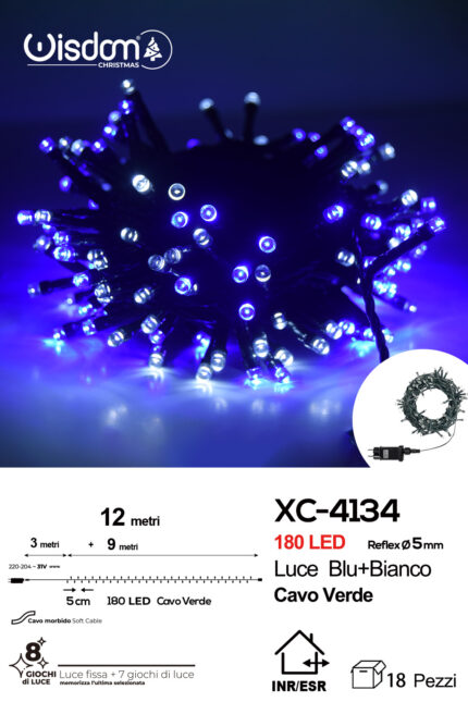 Catena luminosa 180 LED luce blu+bianca da 12 metri con 8 giochi di luce ip44 per uso interno esterno