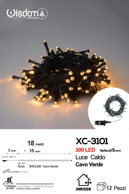 Catena luminosa 300 LED luce calda+bianca da 18 metri con 8 giochi di luce ip44 per uso interno esterno