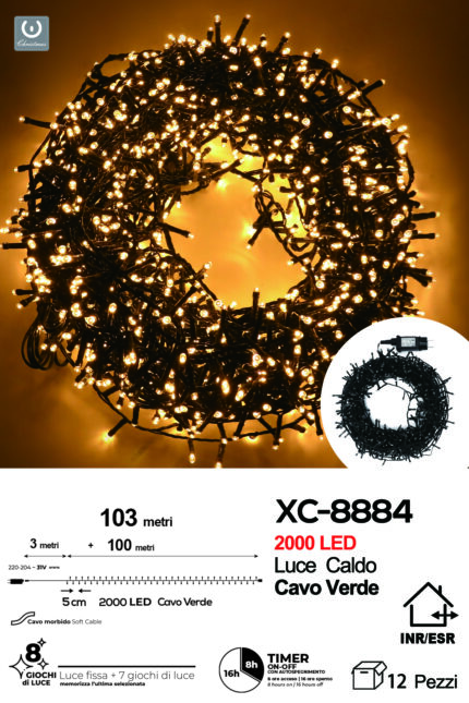 Catena luminosa 2000 LED luce calda da 103 metri con 8 giochi di luce ip44 per uso interno esterno