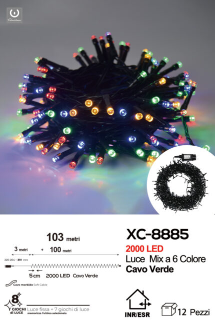 Catena luminosa 2000 LED luce multicolor da 103 metri con 8 giochi di luce ip44 per uso interno esterno