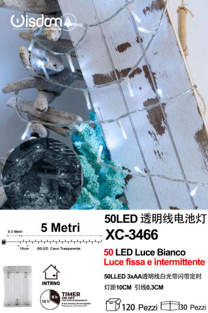 Catena luminosa 50 LED luce bianca da 5 metri alimentazione a batterie (non incluse) per uso interno funzione timer on/off