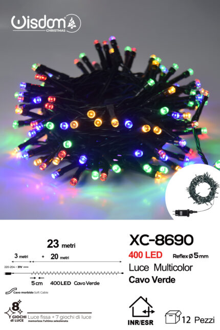 Catena luminosa 400 LED luce multicolor da 23 metri con 8 giochi di luce ip44 per uso interno esterno