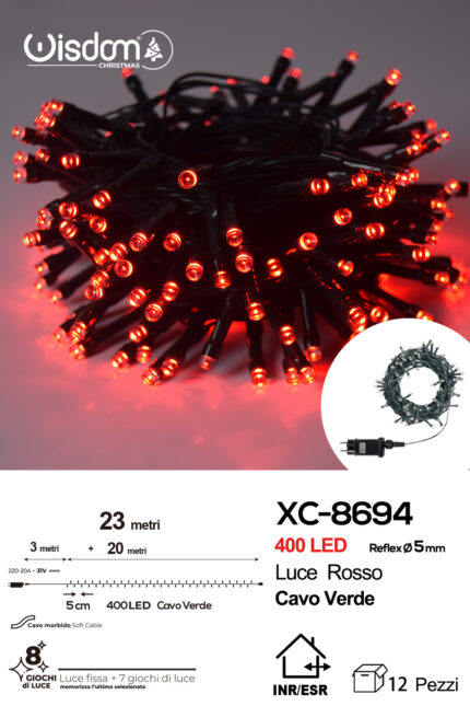 Catena luminosa 400 LED luce rossa da 23 metri con 8 giochi di luce ip44 per uso interno esterno