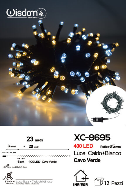 Catena luminosa 400 LED luce calda+bianca da 23 metri con 8 giochi di luce ip44 per uso interno esterno