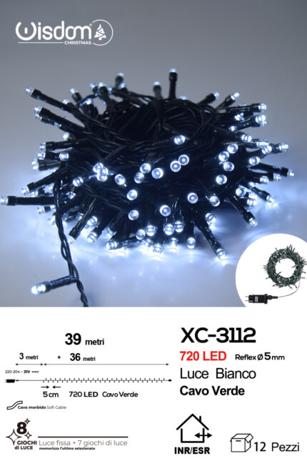 Catena luminosa 720 LED luce bianca da 39 metri con 8 giochi di luce ip44 per uso interno esterno