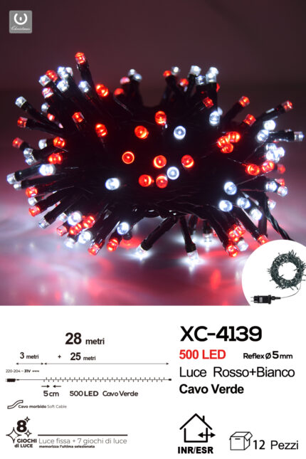Catena luminosa 500 LED luce rossa+bianca da 28 metri con 8 giochi di luce ip44 per uso interno esterno