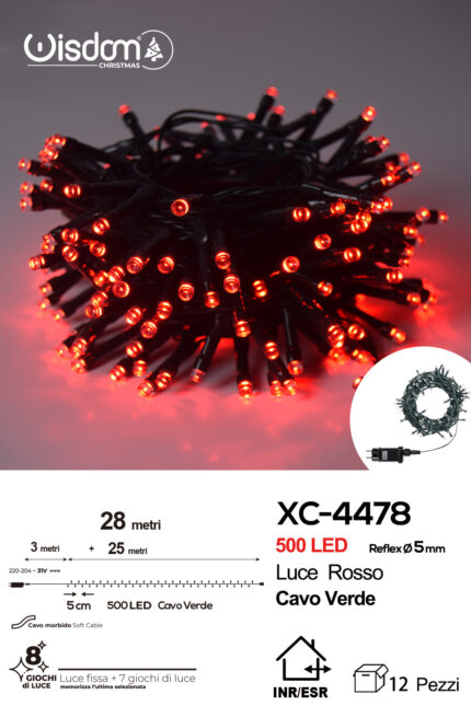 Catena luminosa 500 LED luce rossa da 28 metri con 8 giochi di luce ip44 per uso interno esterno