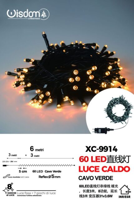 Catena luminosa 60 LED luce calda da 6 metri con 8 giochi di luce