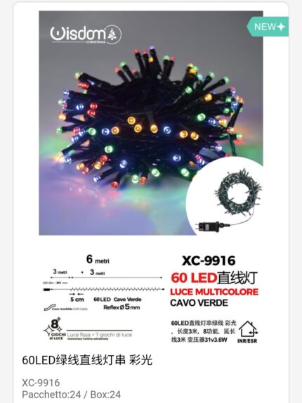 Catena luminosa 60 LED luce multicolor da 6 metri con 8 giochi di luce ip44 per uso interno esterno