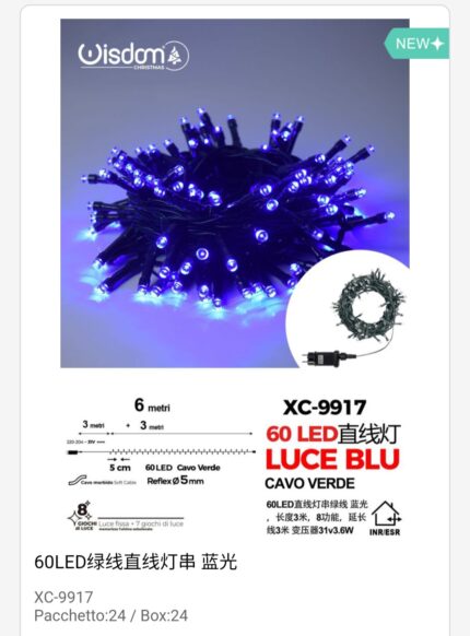 Catena luminosa 60 LED luce blu da 6 metri con 8 giochi di luce ip44 per uso interno esterno