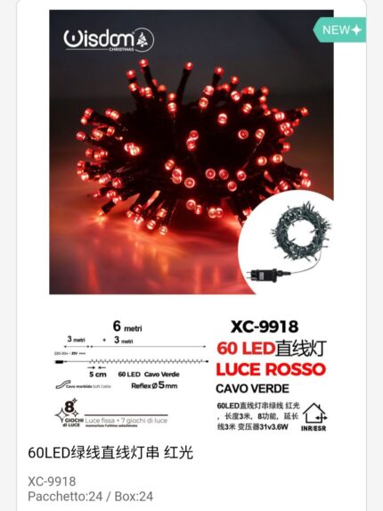 Catena luminosa 60 LED luce rossa da 6 metri con 8 giochi di luce ip44 per uso interno esterno